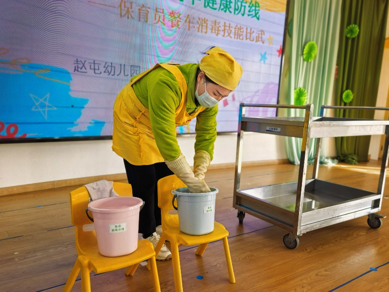 怀着对职业的敬畏、对孩子的关爱,赵屯幼儿园开展了第十一届“保育能手”评比活动暨“守护舌尖安全 筑牢健康防线”保育员餐车消毒技能比武活动和保育员应知应会测试。