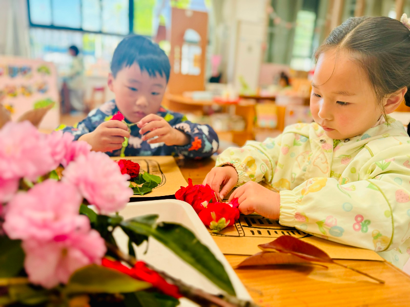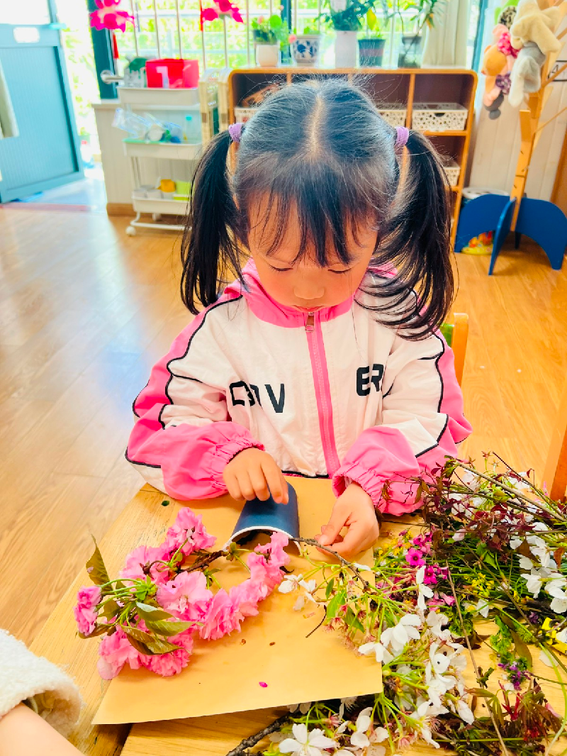 探春创作中,孩子们以落叶、花瓣、树枝为素材,创意制作风筝、花篮,为芭蕾女孩设计春日裙装,用天马行空的想象,将自然馈赠变为独一无二的手工作品,留住春日生机与美好。