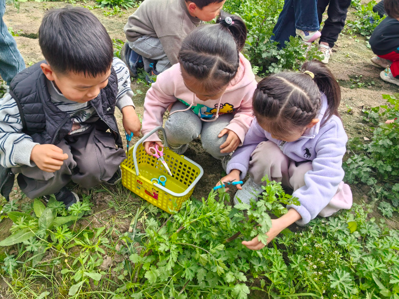 寻春阶段,家园联动走进田野、公园、菜市场,寻觅马兰头、荠菜、春笋等春日野菜,幼儿在老师带领下亲手采摘,认识野菜特征、了解生长知识,在劳动中感受自然馈赠。